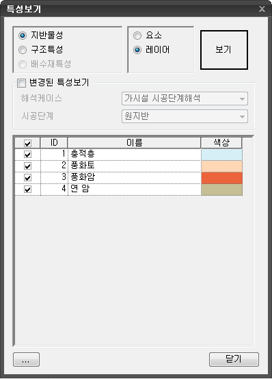 | 기능 | 지반물성/구조특성/배수재특성이 할당된 요소/레이어에 ID를 표현하는 기능입니다. '속성변경' 기능으로 변경된 특성정보도 확인할 수 있습니다. |