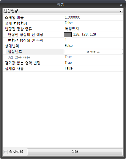 | 기능 | 변형형상의 그래픽 처리에 대한 상세항목을 지정합니다. 그래픽 결과가 '변형 전 형상'일 경우 적용되지 않습니다. |