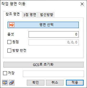 평면 : 3개의 점을 선택하여 작업 평면을 이동합니다. 선택한 점들로부터 정의되는 평면으로