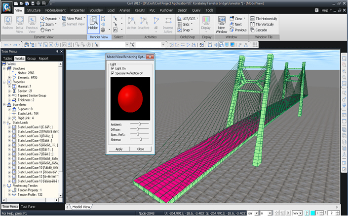 In Render View Mode, the modeling functions (selection, addition, modification, removal of model data, etc.) and the functions related to the creation of animations do not work. The results (reaction, displacement, member force, stress, etc.) can be verified on the screen through identical manipulations associated with Model View Mode, except for the printing of numerical values.