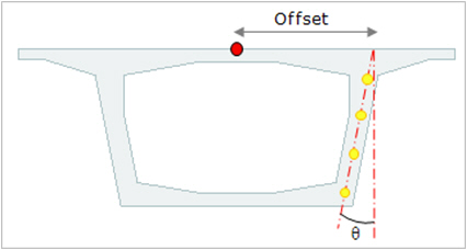 3-D Tendon Profile is defined in 3-dimensional coordinates. Curve Type: Specify the type of curvature for tendon placement. Spline: Calculate the minimum polynomial curvature connecting the points defining the tendon profile and auto-place the tendons Round: Place the tendons following the circle, which forms tangents to the straight lines connecting the points defining the tendon profile. Typical Tendon: This is a function for defining a lumped representative tendon. If this option is checked on and the number of tendons is inputted, the generated tendon profile is multiplied by the inputted number of tendons when analysis is performed. For simple analysis, such as the schematic design of a bridge, inputting 3 dimensional tendon profiles is time consuming. Therefore, using the function of lumped representative tendon, which defines only one tendon profile for analysis, the time required for generating the model and performing analysis can be reduced. After analysis is performed, the results for only one tendon are displayed. No. of Tendon: Number of lumped representative tendons Type of Input: Distance: The actual vertical distance of the bridge 10th Point: Divide the span into 10 even parts and use distance rates to make inputs. Ref. of z-axis: The origin of the z coordinate Top: Distance from the top Bottom: Distance from the bottom Point of Sym. First: The starting point of the current Tendon is assumed to be the axis of symmetry. Last: The end point of the current Tendon is assumed to be the axis of symmetry.