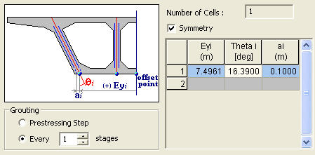 Once the ducts are grouted, the transformed section properties of tendon and grout are subsequently considered. The input signifies the timing of incorporating the transformed properties. Note Prestressing step Every n Stage Define Tendon Property Number of Cell Symmetric Ht: Vertical distance from the top edge of the section to the top tendon Hb: Vertical distance from the top end of the section to the bottom tendon Position: Select either Top or Bottom. Baseline(m): Enter the Baseline position, which will become a reference to simplify horizontal tendon placement. Bli(m): Among the tendons located at the left part of the web, enter the horizontal distance between the Baseline and the tendon, which is closest to the Baseline. Input a positive value regardless of the direction. Nli: Enter the number of tendons located at the left part of the web. Bri(m): Among the tendons located at the right part of the web, enter the horizontal distance between the Baseline and the tendon, which is closest to the Baseline. Input a positive value regardless of the direction. Nri: Enter the number of tendons located at the right part of the web. ai: Enter the tendon spacing. Tendon Property: Select the Tendon Property Type.