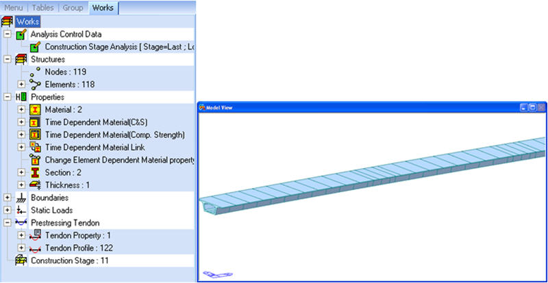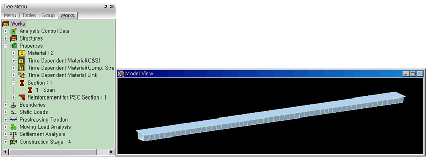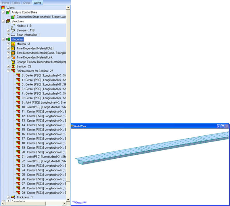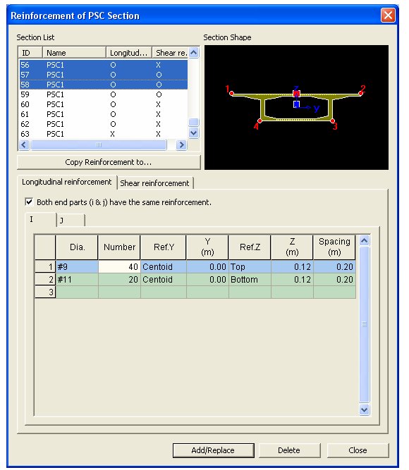 Assign the section variation and reinforcement information along the primary direction. Definition of section variation: Upon investigating the sections of FCM or FSM bridges, the user can observe that the PSC Box section does not change uniformly, but generally each section part varies differently. For example, consider a case where the thickness of the top flange is constant, bottom flange varies according to a 2nd order equation, and the web varies linearly. In this case, there is a limit for the Tapered Section Group function to model this type of bridge, and the user should modify the model after this function is applied. However, by using the Section & Reinforcement function, the user can define the variation in each section by parts and, thus, a more detailed model can be generated. Assigning Reinforcement information: By using the Reinforcement of PSC Section function that has been incorporated in midas Civil version 7.0.1, the user can input the reinforcement information (transverse, shear and torsion) for a PSC Type Section. Since this method inputs the reinforcement information by each section, it is not applicable for PSC Box bridges in which the reinforcement varies along the primary direction. Therefore, to model the variation of reinforcement along the primary direction by using this function, there is a slight inconvenience in subdividing the elements into parts and then defining the reinforcement in each section. However, by using the Section & Reinforcement function and inputting the reinforcement information along the primary direction, the program automatically divides the elements and defines the sections for the user. This will minimize the time required for a generating a particular model. After inputting the section variation and reinforcement information, and then executing the Wizard, the element divides automatically, generates tapered sections, and inputs the reinforcement information for each section. Applicable sections: 1CELL, 2CELL, nCELL, nCELL2, Tee, and CMPWEB of PSC sections are applicable. Non-symmetrical sections are not applicable, except the Tee section. |