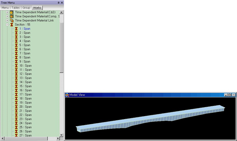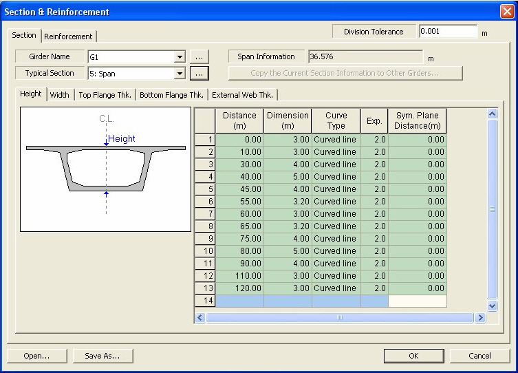 Division Tolerance The program automatically divides the element with respect to the variation in section dimensions and the input of reinforcement information. If the distance between the new automatically generated node and the existing node is less than 0.001m then the program uses the existing node. This stops the program to generate too many fine elements caused by auto generation. Defines the variation of section dimensions through the primary direction of the bridge. Girder Name Select the girder to define variation of section dimension from the predefined girder list of Span Information. If no girders are defined then click on [..] button and define a new girder. The number of characters of the name is limited to up to 28. Typical Section Select the typical section to use for defining the variation of section dimension Span Information Displays the Span Information of the selected girder.
