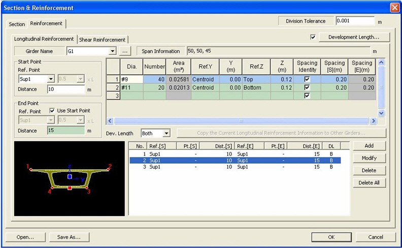 Input the reinforcement information through the primary direction. Girder Name Select the girder to define the information of reinforcement from the predefined girder list of Span Information. If no girders are defined then click on [..] button and define a new girder. Starting Point: Enter the starting point of the reinforcement. Ref. Point: Enter the Ref. Point to define the starting point of the reinforcement. Ref. Point can be entered as the support or any tenth of the span (0.1L, 0.2L, etc.). Distance: Enter the distance from the defined Ref. Point. The reinforcement starts from this point. Negative values can also be inputted. Reinforcement is entered 10 m from the starting point. Reinforcement is entered 10 m from 0.2L of the second span. End Point: Enter the end point of the reinforcement. Ref. Point: Enter the Ref. Point to define the end point of reinforcement. Ref. Point can be entered as the support or any tenth of the span (0.1L, 0.2L, etc.). If the box is checked on, then the Ref. Point defined from the Starting Point is used. Distance: Enter the distance from the defined Ref. Point. The reinforcement ends at this point. Negative values can also be inputted. Dia.: Enter the diameter of the rebar. Number: Enter the number of the rebar Area: Enter the cross-sectional area of the total reinforcement. Ref.Y Assign a standard point in the section to input the transverse direction of the reinforcement. Centroid locates the centroid of the rebar to the center of the section and Left locates the rebar from the left side of the section. Y : The transverse direction distance from the standard point (Ref. Y) to the centroid of the primary direction rebar. Ref.Z : Assign a standard point in the section to input the perpendicular direction of the reinforcement. Select either Top (Top of the section) or Bottom(Bottom of the section). Z : The perpendicular direction distance from the standard point (Ref. Z) to the centroid of the primary direction rebar. If TOP is selected then from the top of the section towards the rebar is the positive direction. And vise versa if BOT is selected. Spacing Identity: Checking this option the rebar spacing of the starting point and end point the defined interval (Start to End) will be inputted identically. Spacing [S]: The rebar spacing of the starting point of the defined interval. Spacing [E]: The rebar spacing of the ending point of the defined interval.