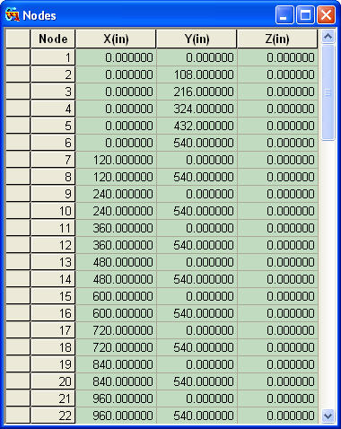 From the Main Menu select Node/Element > Nodes > Nodes Table. Shortcut key: [Ctrl]+[Alt]+N |