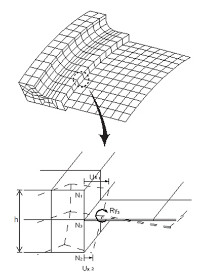 Since the constraint Eq. (1) or (2) allows to constrain any node and any DOF, the range of their applications is quite extensive. The constrain equations are applied to the degrees of freedom defined in GCS. Fig. 1 shows an application example in which a connection is made between a 3-D structure consisted of solid elements and a thin plate consisted of plate elements. Since solid elements do not have stiffness against rotational DOF, they cannot restrain the rotational behavior of the connected plate. If the rotational DOF of the connected part is restrained using Eq. (3), the plate elements would generally behave perpendicularly to the connection.