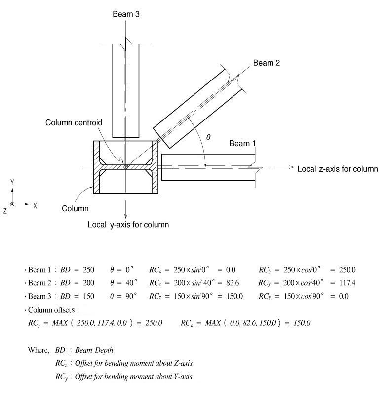 The panel zones for column members are determined by the directions and depths of the girder members connected to the column members. The panel zones for column members are separately calculated for moments about local y and z-directions.