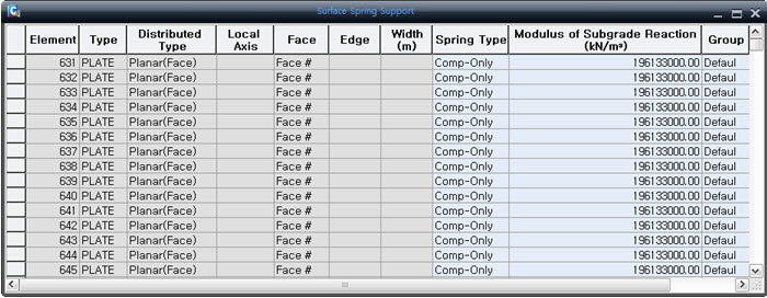 Element: Element number Type: The type of element Distributed Type: The type of distribution of surface spring supports Local Axis : Displays the direction of defined elements for the case of frame type. Face: Display element numbers that the distributed surface spring supports are applied to. Edge: Display edge numbers that the distributed surface spring supports as a planer (edge) type are applied to. Width : Indicate selected width that is set to calculate the supporting stiffness of beam element per unit length. Spring Type: Select the type of spring (Linear / Compression only / Tension only). Modulus of Subgrade Reaction : Define the modulus of subgrade reaction. Group : Indicate the boundary group of each element.
