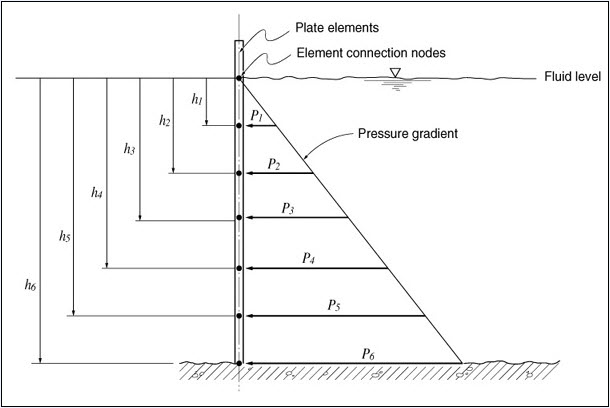 Enter the hydrostatic pressure (fluid potential) loads at the edges or faces of Plate, Plane Stress, Plane Strain or Solid Elements. The loads can be specified as linear loads or curved loads. Curved loads can be used for earth pressure (such as due to earthquakes) acting on underground structures.