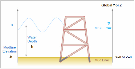 In the figure above, the left vertical axis is with respect to the mean sea level. The right vertical axis is with respect to the Mudline and will be used in the modeling. Wave loads are not applied to the elements located below mud line, or elements marked in gray in the figure above.