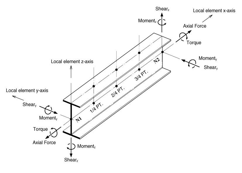 Min/Max: Minimum and maximum internal forces are numerically displayed at the corresponding locations among the 5 points of (4-sectioned) beam elements.