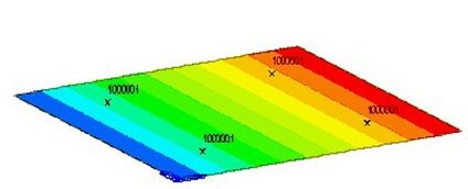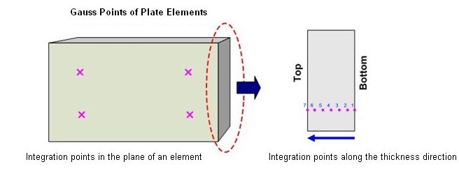 For displaying Yield Points on a Plate Element, a Laminated Shell model with 7 layers has been used in order to consider material nonlinear analysis. To check the yield state of Gauss Points, "0,1" is applied from bottom to top. "0" represents the state of elasticity and "1" the state of yielding. For rectangular or triangular elements, the method of displaying "0,1" is identical.
