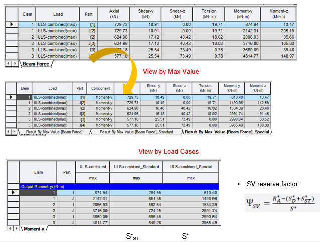 Select load cases to be displayed among moving loads, support settlements, time history loads or load combinations to combine those load cases. Axial: Display the other member forces simultaneously at the time of maximum or minimum axial forces (Fx). Shear-y: Display the other member forces simultaneously at the time of maximum or minimum shear forces (Fy). Shear-z: Display the other member forces simultaneously at the time of maximum or minimum shear forces (Fz). Torsion: Display the other member forces simultaneously at the time of maximum or minimum torsions (Mx). Moment-y: Display the other member forces simultaneously at the time of maximum or minimum moments (My). Moment-z: Display the other member forces simultaneously at the time of maximum or minimum moments (Mz). Note 1 Result by Max Value [Beam Force] cannot be sorted so prior to executing the View by Max Value Item, Result [Beam Force] should be sorted by a desired output format.
