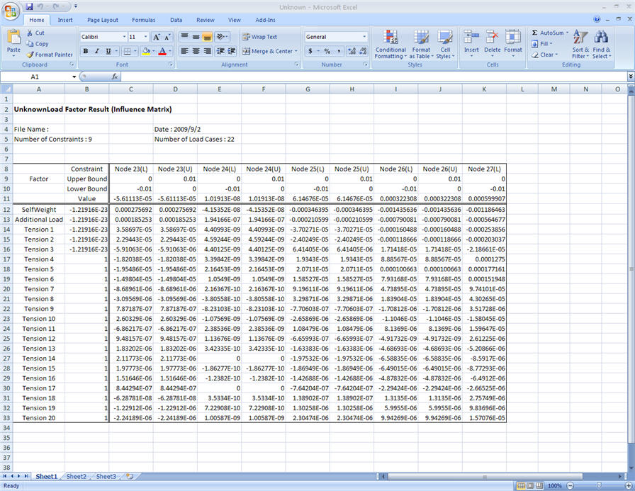 The calculated results of Unknown Load Factors including Influence Matrix are produced in an Excel file.