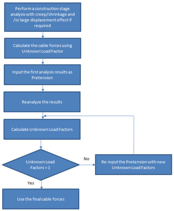 In order to calculate unknown load factors using optimization techniques, load combinations, load cases pertaining to the unknown load factors, specific constraints and object functions are required. All these data are collected in a unique and unknown load factor group for analysis. Several groups can be formulated where they can be saved, modified or deleted. Note The unknown load factors obtained by using the Unknown Load Factor feature for the final stage model do not include the change in stiffness of the cable due to the change in pretension and hence the user must perform iterations to determine the pretension in the cables to satisfy constrains. The following procedure can be adopted: 1. Define the constraints and obtain the Unknown Load Factors for the Cable Pretension Forces. 2. Determine the Cable Pretension Force by multiplying those factors with the assigned Cable Forces 3. Change the Cable Pretension Forces with the new ones ( obtained in step 2) 4. Perform the Analysis. 5. Check whether the constraints are satisfied with modified pretensions 6. If not then determine the Unknown load factors again and keep repeating steps 2 to 5 till you get the constraints satisfied after static analysis ( step 5)
