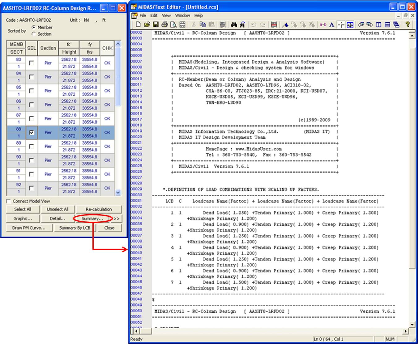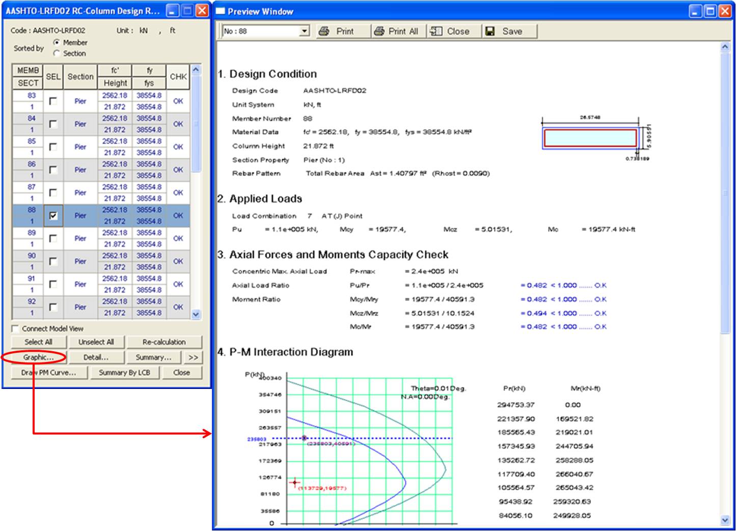 The automatic design results sorted by elements are based on the maximum axial forces, biaxial moments and shear forces calculated at the positions (I, 1/4, 1/2, 3/4 & J) of each element in accordance with the load combinations for concrete design. Factored strength ratios with respect to the design strengths are evaluated on the basis of P-M interaction diagrams. The automatic design results sorted by section properties are based on the results that produce the maximum strength ratios in the P-M diagrams by considering all the elements and locations pertaining to each section property in accordance with the load combinations for concrete design. The results appear in blue when the automatic design for the given properties is satisfactory, otherwise they appear in red, which represent the results are unsatisfactory. The automatic design provides optimal rebar sizes, the number of rebars and the number of rows of rebars satisfying the rebar spacing and ratio, using the main rebars (maximum 5 types) and sub-rebars (1 type) entered by the user. The automatic design results are produced in the unit system selected by the user. SEL: Select members for redesign and production of results ELEM: Element number SECT: Section property number Shape: Symbol for sectional shape = SB: Rectangular section = B: Rectangular section with hollow core = SR: Circular section = P: Circular section with hollow core = STRK: Track type section = TRK: Track type section with hollow core = HTRK: Half track section = SOCT: Octagonal section = OCT: Octagonal section with hollow core Bc, Hc: Width, height (depth) of column member a, b: Corner dimensions of octagonal section t: Thickness of hollow core section f'c (fck): Design compressive strength of concrete ( if Design code is Eurocode2-2:05) Height: Height (length) of column member fy (fyk): Design yield strength of main rebars. ( if Design code is Eurocode2-2:05) fys (fyw): Design yield strength of shear rebars ( if Design code is Eurocode2-2:05) CHK: Status of automatic design results (Results are produced in the