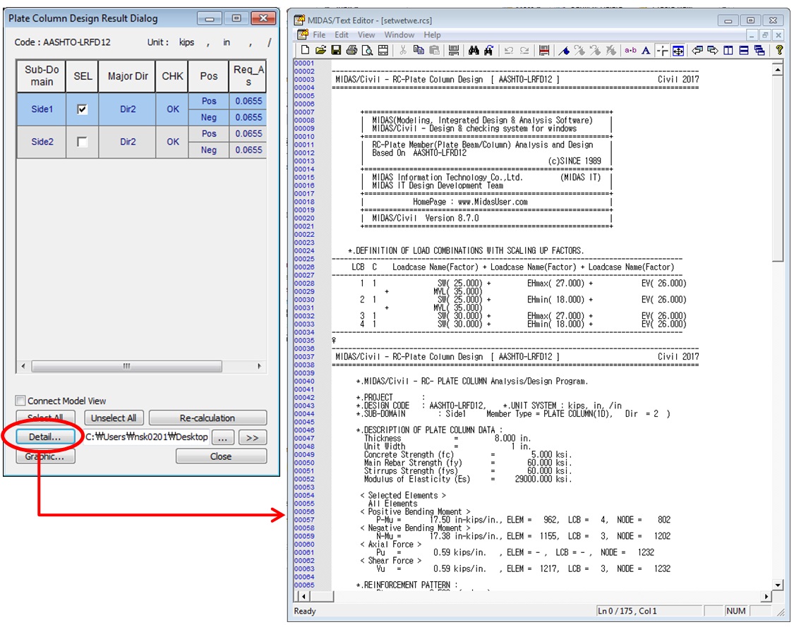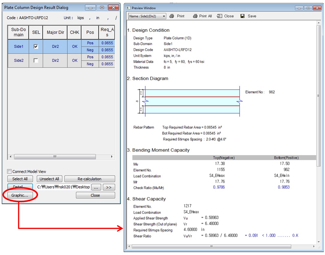 The above symbols representing the status are combined to show "OK, OK++, OK--, etc. Pos : The design results for Pos and Neg reflect the automatic design for maximum required reinforcement area for Req_As : The area of required rebars (LengthUnit2 / LengthUnit) for the bending moment calculated by the program. Elem. : Element number. Node : Node number. LCB_M : Load combination which causes the maximum required reinforcement due to bending moment of specific sub-domain. Mu : Maximum factored bending moment occurring in the node of element of relevant sub-domain under the load combination Mr : Bending moment resistance calculated by the program of the plate element. Ratio_M : Ratio of the factored bending moment to the design bending moment strength. The ratio larger than 1 signifies, LCB_P : Load combination which causes the maximum factored axial force in the relevant sub-domain. Pu : Maximum factored axial force acting on the plate column member occurring in the node of element of relevant sub-domain under the load combination displayed in LCB_P. Pr : Nominal axial strength of the plate element. LCB_V : Load combination which causes the maximum required reinforcement due to shear force of specific sub-domain. Vu : Maximum factored shear force occurring in the node of element of relevant sub-domain under the load combination Vr : Shear force resistance calculated by the program of the plate element. Ratio_V : Ratio of the factored shear force to the design shear strength. The ratio larger than 1 signifies, the design is As_V : The quantity of shear rebars auto-calculated by the program of the sub-domain from the inputted stirrup data. Stirrup : Size and spacing of stirrup provided by the user. Note From Civil 2018 v2.1, Axial-Moment Interaction can be considered as an option for plate column design and checking. This feature is available for AASHTO-LRFD12 and Eurocode. The result of P-M Interaction curve can be obtained from graphic result. Common Control