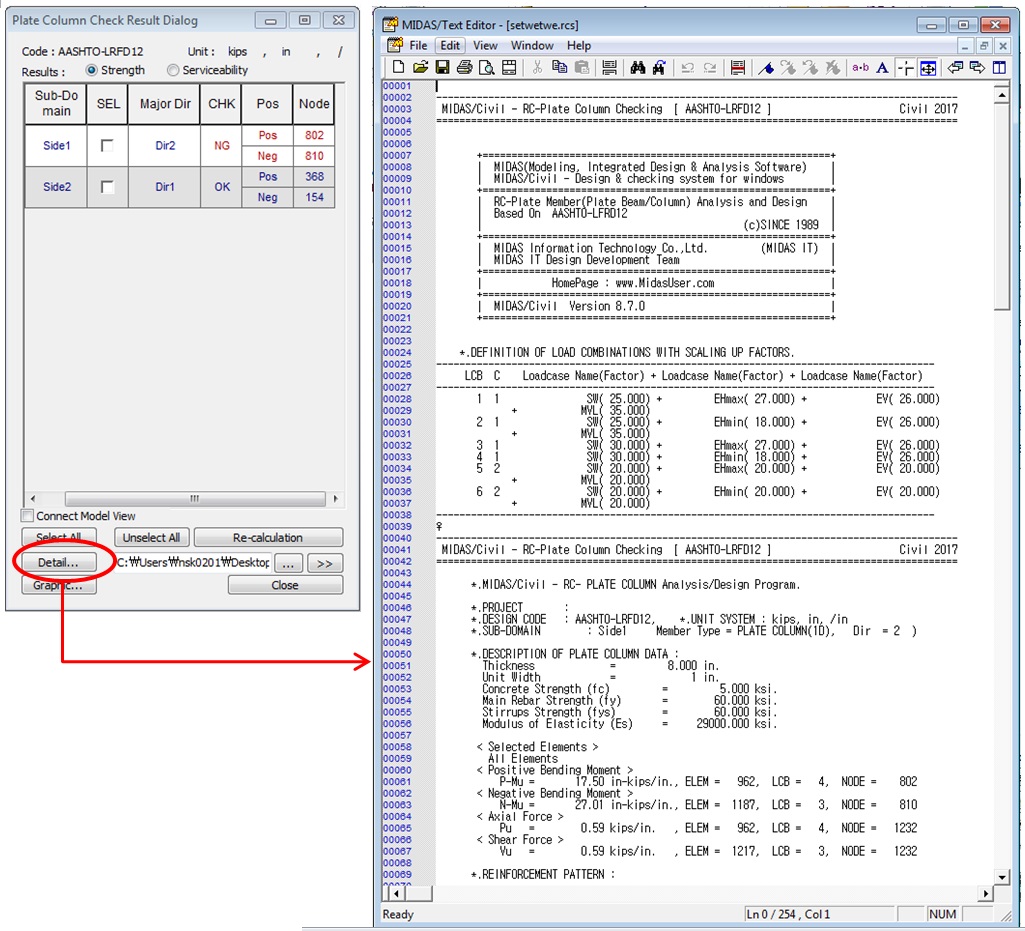 The above symbols representing the status are combined to show "OK, OK++, OK--, etc. Pos : The design results for Pos and Neg reflect the automatic design for maximum required reinforcement area for the positive and negative bending moment respectively. Use_As : The area of rebars (LengthUnit2 / LengthUnit) for the bending moment calculated by the program. Elem. : Element number. Node : Node number. LCB_M : Load combination which causes the maximum factored bending moment in the relevant sub-domain. Mu : Maximum factored bending moment occurring in the node of element of relevant sub-domain under the load combination displayed in LCB_M. Mr : Bending moment resistance calculated by the program of the plate element. Ratio_M : Ratio of the factored bending moment to the design bending moment strength. The ratio larger than 1 signifies, the design is unsatisfactory. LCB_P : Load combination which causes the maximum factored axial force in the relevant sub-domain. Pu : Maximum factored axial force acting on the plate column member occurring in the node of element of relevant sub-domain under the load combination displayed in LCB_P. Pr : Nominal axial strength of the plate element. Ratio_P :Ratio of the factored axial force (Pu) to the design axial strength ( LCB_V : Load combination which causes the maximum factored shear force in the relevant sub-domain. Vu : Maximum factored shear force occurring in the node of element of relevant sub-domain under the load combination displayed in LCB_V. Vr : Shear force resistance calculated by the program of the plate element. Ratio_V : Ratio of the factored shear force (Vu) to the design shear strength (