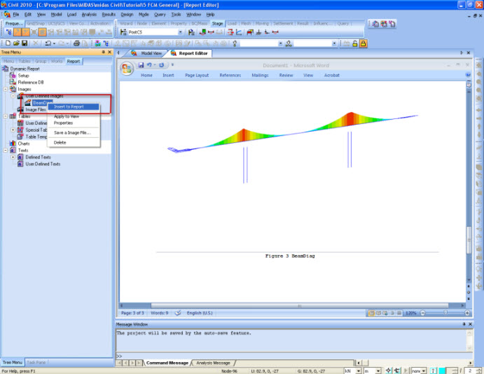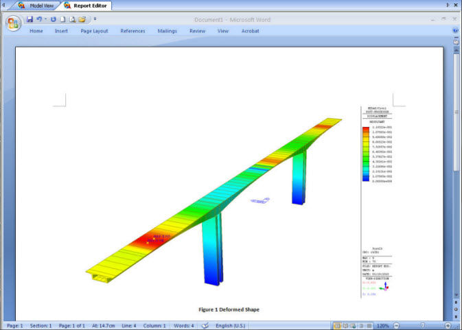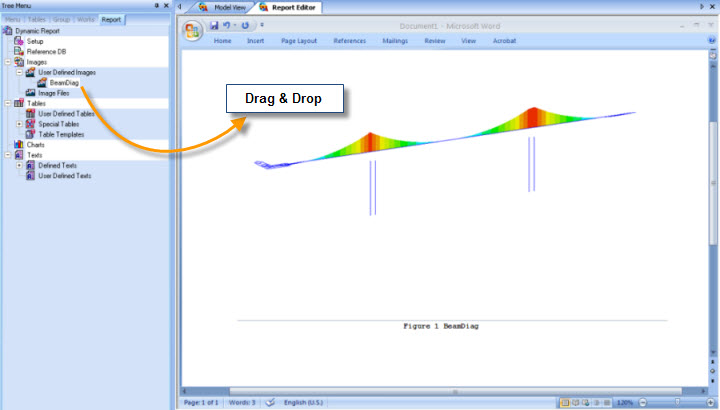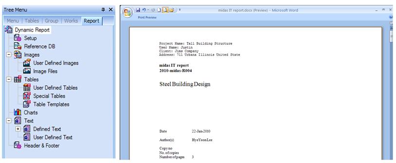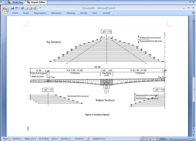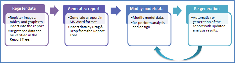 Generate a report using analysis and design results from midas Civil. All the input and output data can be plotted (ie. material properties, section properties, reactions, member forces, displacements, stresses, section verification results, etc.) in a diagram, graph, text, or table format. All of the data entered in the report can be modified and saved by the user in MS Word format without any limitations. Also, the user can open and modify the pre-generated report or any other report in MS Word format. Using the Dynamic Report Regenerator, we can easily update contents of the report by reflecting changes in a model file.