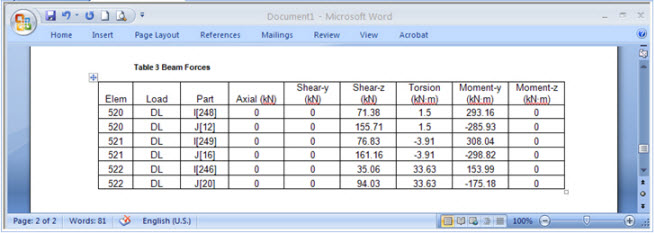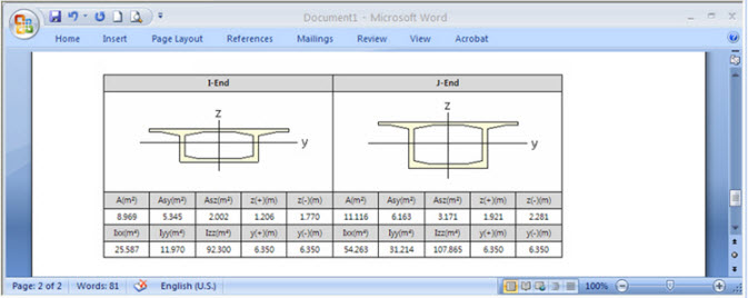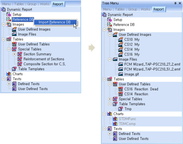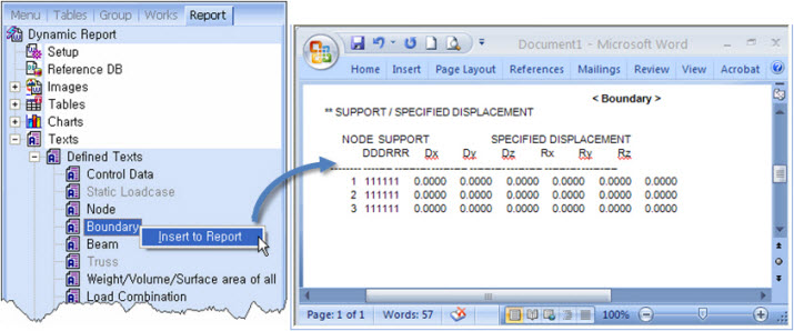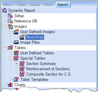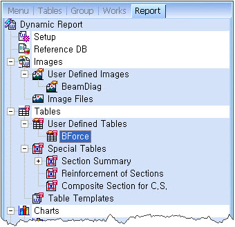 The following data format can be inserted in the report: inserted: When inserting data into the report, the user needs to manually register the desired data into the Report Tree. However, for the user's convenience, midas Civil provides general data such as section properties, boundary conditions, etc. in Tables > Special Tables and Texts > Defined Texts from the Report Tree. Therefore the user does not need to register the following data separately: Tables > Special Tables Section Summary Reinforcement of Sections Composite Section for C.S. Texts > Defined Texts Control Data Static Load Case Story Node Boundary Floor Diaphragm / Rigid Link Beam / Truss / Wall Weight / Volume / Surface area of all member Wind Load / Seismic Load Load Combination Self Weight Nodal Load Finishing Material Load System Temperature / Nodal Temperature / Element Temperature / Beam Section Temperature pushover Global Control / Pushover Load Case