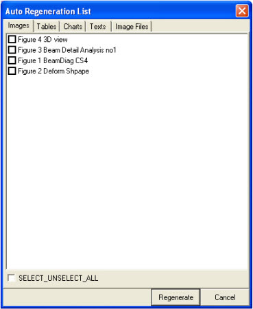 If there are any changes in the model file, we can automatically update the pre-generated report. If the user manually entered additional text or images into the report, those data will remain without any changes. (1) Select Tools > Dynamic Report Image menu from the Main Menu, or click (2) All the entered data will be displayed in each tab by data formats. Select the desired data to be updated. (3) Click