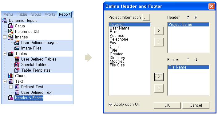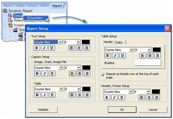Text Setup : Define font format for Caption Setup : Define font for Table Setup : Select the font of table contents in the Data tab. Select the font of table header in the Header tab. Header, Footer Setup : Define font format for header and footer of the report.