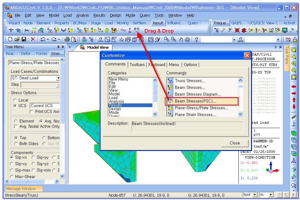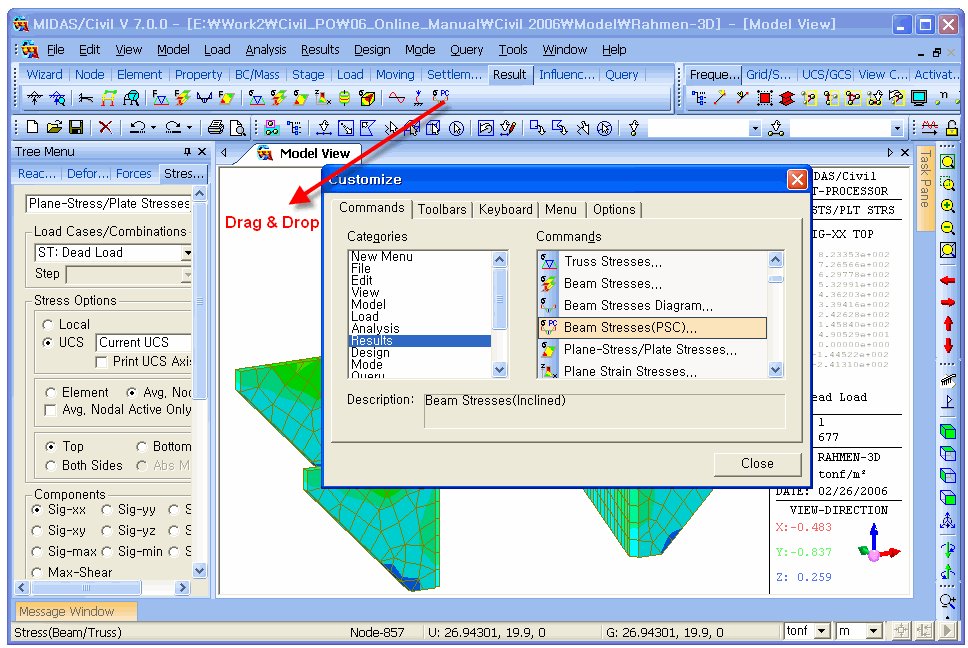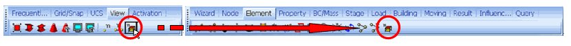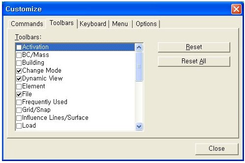 Main Component and Sub Component Toolbars are categorized by command groups in the Tabbed Toolbar format, which allows even a beginner to gain easy access to the Icon Menu. Main Component is composed of View and Graphic related Icons, and Sub Component is composed of the Icons used in Pre-processor and Post-processor. The Icons used in Pre-processor are Wizard, Node, Element, Property and BC/Mass for modeling, and Load for loading input. Result Icon Menu is used in the Post-processor. Lay out frequently used commands in the "Frequently Used Toolbar" of the Main Component Toolbar, which will be quite useful. There is no limit to the number of commands that can be placed in the "Frequently Used Toolbar" Each command can be placed, as per the preference of the user, by freely moving or copying the commands. Move a command to the desired position by dragging it from Tools > Customize > Customize. Copy the Icon Menu to the desired position by dragging it while pressing the [Ctrl] key.