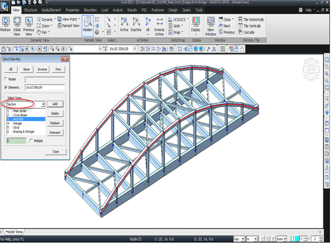 Select Identity-Section In the case of Element Type, Material, Section and Thickness noted above, assign the elements with desired attributes in the Working Window rather than selecting the desired entities in the attributes sub-list. When using the function, select a desired identity in the Identity list, click the entry field at the bottom of the sub-list and assign the entities of desired attributes in the Working Window. Check ( Use the following buttons to add, remove or replace selected entities. Add: Add the selected entities to the existing selection list. Delete: Remove the selected entities from the existing selection list. Replace: Substitute the selected entities for the registered contents in the existing selection list. Intersect: Select only the nodes or elements satisfying the multi-select entity conditions from the existing selection list. (ex.: beam elements at 10th floor)