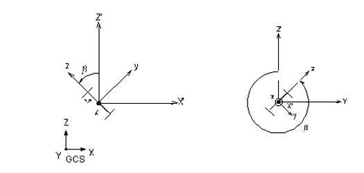 If the ECS x-axis for a line element is parallel with the GCS Z-axis, the Beta angle is defined as the angle formed from the GCS X-axis to the ECS z-axis. The ECS x-axis becomes the axis of rotation for determining the angle using the right-hand rule. If the ECS x-axis is not parallel with the GCS Z-axis, the Beta angle is defined as the right angle to the ECS x-z plane from the GCS Z-axis (See below).