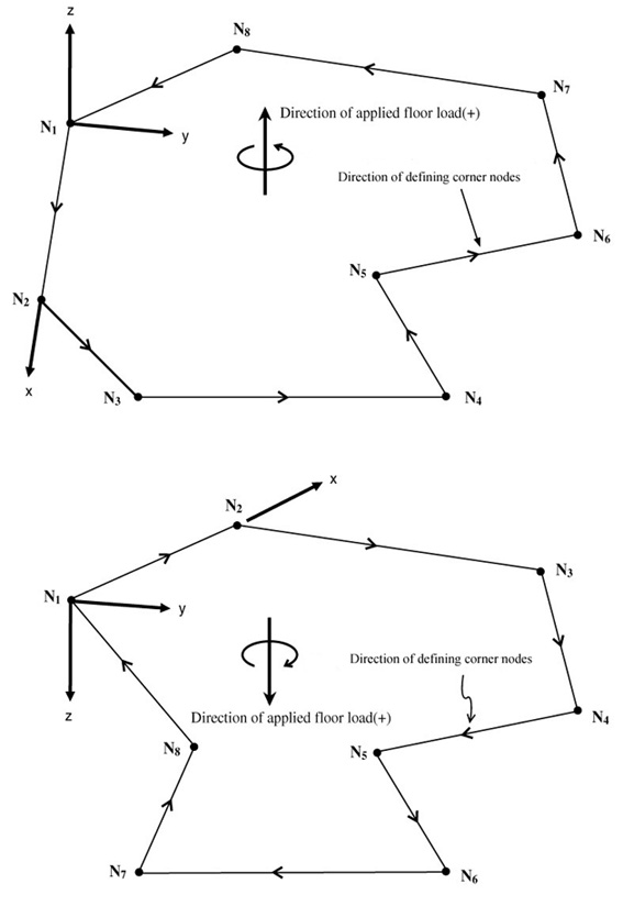 Assign the corner nodes defining the loaded area consistently in the chosen rotational direction. You may directly enter the node numbers or click the entry field and the nodes in the Model Window using Node Snap. The floor plate local coordinate system and the loading signs are defined by the assignment sequence of the corner nodes. (Refer to Fig. 3)