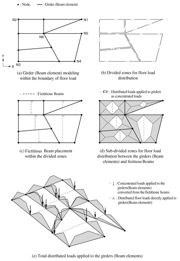 According to the distribution concept shown in <Fig. 7> on the basis of re-divided sub-loaded areas, the distributed loads are applied to the beam elements and the sub-beams as shown in <Fig. 7(d)>. The distributed loads applied to the sub-beams are converted into (assume that both ends are pinned) the reactions at both ends.