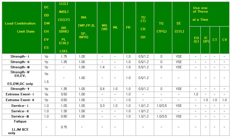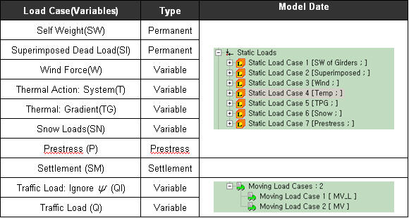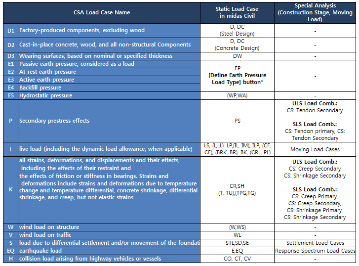 Note 2 Dead Load(D) Dead Load of Component and Attachments(DC) Dead Load of Wearing Surfaces and Utilities(DW) Downdrag(DD) Live Load(L) Trailer or Crawler Induced Live Load(LC) Overload Live Load(LP) / AASHTO Roof Live Load(LR) Wind Load on Structure(W) Earthquake(E) Temperature(T) Snow Load(S) Rain Load(R) Live Load Impact(IL) Overload Live Load Impact(ILP) / AASHTO Earth Pressure(EP) Horizontal Earth Pressure(EH) Vertical Earth Pressure(EV) Live Load Surcharge(LS) Trailer or Crawler Induced Surcharge(LSC) Earth Surcharge Load(ES) Buoyancy(B) Ground Water Pressure(WP) Fluid Pressure(FP) Stream Flow Pressure(SF) Ice Pressure(IP) Wind Load on Live Load(WL) Longitudinal Force from Live Load(BK) Centrifugal Force(CF) Rib Shortening(RS) Shrinkage(SH) Creep(CR) Prestress(PS) Collision Load(CO) Vehicular Collision Force(CT) Vessel Collision Force(CV) Construction Stage Load(CS) Erection Load(ER) Locked in Erection Stresses(EL) Braking Load(BRK) Settlement(STL) Wave Pressure(WPR) Crowd Load(CRL) Temperature Gradient(TPG) Friction(FR) Response Spectrum(ESP) EspX: Response Spectrum EspY: Response Spectrum SFx: Scale up factor of X-Direction SFy: Scale up factor of Y-Direction