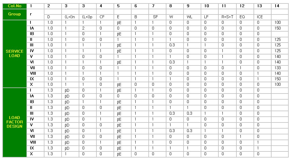 4. Import a load combination (fn.lcb) file to generate load combinations Click The fn.LCB file type is as follows: Sequential number, combination method, unit load case i, load factor i, unit load case j, load factor j, ... Examples) 1, , 1, 1.0, 2, 1.0 2, , 1, 1.4, 2, 1.7 Note blank, 0: Add 1: Envelope 2: ABS 3: SRSS