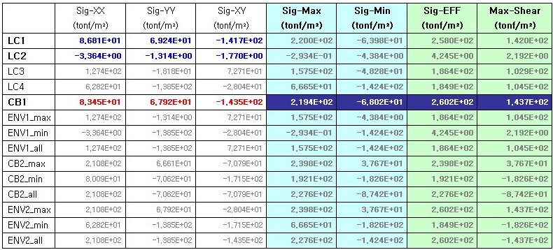 ☞ CB2_max = CB1+ENV1_max CB2_min = CB1+ENV1_min CB2_all = CB1+ENV1_all a. Based on the stresses of CB2_max, CB2_min and CB2_all for each stress component, Sig-Max, Sig-Min, Sig-EFF and Max-Shear are recalculated. b. CB2 load combination includes Envelope type load combinations, but it is an Add type load combination. First, calculate the sum of the stresses of all load cases for each stress component and recalculate the principal stress, effective stress, etc based on the sum of the stresses for each stress component.
