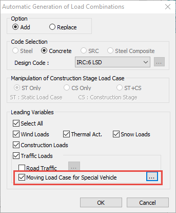 If load combination consists of Special Vehicle, loads such as wind, seismic, braking, impact, temperature gradient will not considered in that combination. For the load combination with special vehicle the partial safety factor on SV load for verification of equilibrium and structural strength under ultimate Limit state (Basic Combination) and for verification of Serviceability Limit State (Rare Combination) shall be taken as 1.15 and 1.0 respectively. When generating load combinations considering the Special Vehicle, the moving load case with the special vehicle will be classified in the following dialog box.