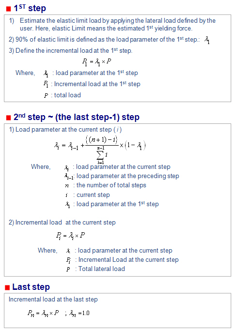 Equal Step (1/n step) : The applied load (Qud) is equally divided by the number of nstep. Incremental Control Function : The applied load (Qud) is divided by the user-defined function. Refer to Design>Pushover Analysis>Pushover Increment Functions to see how to define user-defined function.