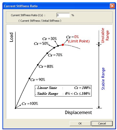 Specify the condition of termination of Pushover analysis. Current Stiffness Ratio (Cs) : If the Current Stiffness Ratio (Cs) is entered and the ratio of the stiffness at the current an incremental step to the initial stiffness reaches the specified value, the analysis is terminated. For example, if the user specifies the Current Stiffness Ratio as 5%, analysis will be terminated when the ratio of the current stiffness to the initial stiffness becomes 0.05.