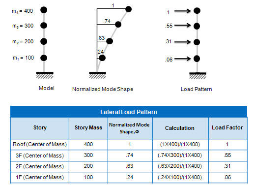 Define the type of load pattern (ratio of magnitude) to be applied to pushover analysis Load Type Static Load Case : Use the load pattern of static load cases that have been defined. Note The combination of load cases multiplied by the corresponding scale factors is used as the load pattern. Uniform Acceleration : he load is distributed relative to the inertia forces developed in the structure, which has been subject to a uniform acceleration. If the acceleration is uniform, the load pattern is determined proportionally to the mass at each story level. Mode Shape : The pushover load pattern retains a mode shape and as such, eigenvalue analysis is a prerequisite. The user can select the orders of natural modes that are applied to determining the pushover load pattern. Normalized Mode Shape* Mass: The Load pattern for the pushover analysis is obtained by the normalized mode shape x mass. Example: