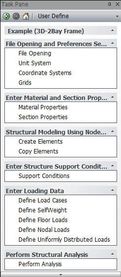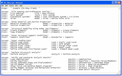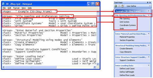Display work procedure, required input items and optional input items for each analysis case. This helps the user to enter the analysis data easily. Task Pane displays work procedure for advanced analysis functions and description on input items so as to enable the user to work more easily. midas Civil provides 4 types of advanced analysis features - Pushover Analysis, Nonlinear Time History Analysis, Time History Analysis and Material Nonlinear Analysis. In addition, Task Pane data can be saved in html format in the User Folder, so that the user can directly write or add the required input items for analysis. In addition, saved data can be invoked with the import function.. |