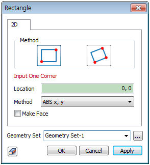 Creates a rectangle using one End point [(Absolute x,y)], a second end point [(Absolute x, y),(Relative x,y)] and the length inputs in this order.