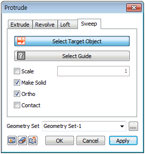 Sometimes complexities in geometry will prevent the desired result from being generated through the sweep functions. In this case, use the Sweep pattern (Main menu > Geometry > Transform > Sweep-Translate) to copy the object profile using the guide curve and use the Loft extend (Main menu > Geometry > Protrude > Loft) to obtain the same result.