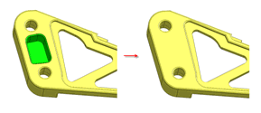 It can also delete the sub-shapes of the solid and stretch the adjacent shapes to fit automatically. For example, deleting a small hole on the solid creates a solid that automatically fills the deleted hole. Selecting a particular face (sub-shape) of a solid cannot maintain the solid shape and so, it is not automatically deleted. In this case, the specified solid needs to be decomposed into faces.