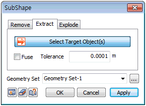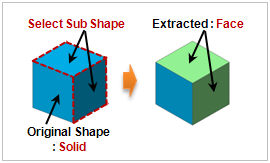 Select the geometry shape (face, line, point) to extract. A face can be extracted from a face, a line from a face and a point from a line. If the extracted shapes are within the error range, check the [Merge] option to merge the shapes into a single shape. For example, an object that is extracted with two adjacent faces, such that the error between the outlines is small, can create a single shell without any free edges.