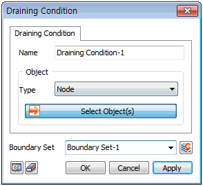 For [Node], the node is directly selected to define the node on which the Drainage conditions will be assigned. Selecting [Edge] or [Face] applies Drainage conditions for all nodes in the geometry shape.