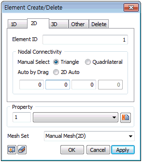 Create a triangular or rectangular element depending on the number of selected nodes. Directly input the node numbers that will become the corners of the 2D element, or select already created nodes in order on the screen. The element ID is automatically set to maximum previous number+1 and when entering the number directly, the number cannot overlap with an existing node number. Properties that will be assigned can be set or added and the mesh set can be created separately. Using the automatic generation function generates a mesh set immediately after node selection.