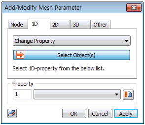 Change the property assigned to a 1D element during its creation. Select the 1D element to modify and specify the property to change.