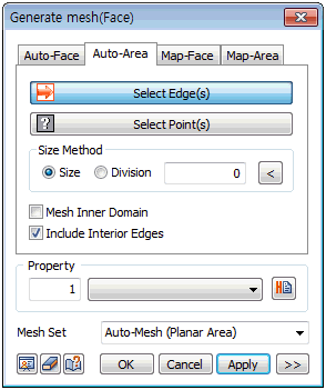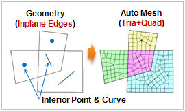 If the closed domain is within another closed domain, use the [Mesh Inner Domain] option to divide the domain and auto-generate. If an interior line (edge) or point is selected, the option identifies the position of the line or point and creates a node. In particular, the [Include Interior Edges] option can extract sub-shapes from an edge and is a vital option when generating a structural element.