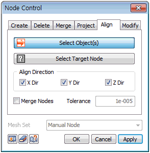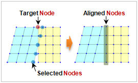 Select the nodes to align and the alignment reference node to move the target nodes in the alignment direction. The alignment direction can be selected from 1 of the X,Y,Z axis directions of the GCS. Selecting all nodes of the element moves the whole mesh. Selecting only some nodes, the unselected nodes remain in their position and the element shape and size automatically changes with the projection distance.