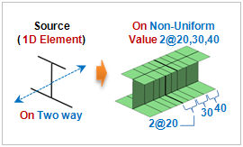 Set the total length and division of 2D element will be created. The division spacing can be set as either uniform or non-uniform. Entering a negative value for length (offset, spacing) extrudes in the opposite direction to the axis or vector direction.
